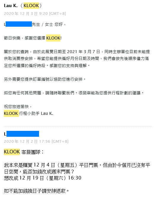 從12月到最近,中途有多次通知更改展期,網站也有協助處理門票事宜