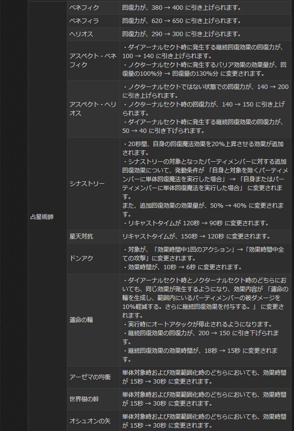 シナストリー | 以隊伍中單人為對象,在對隊友進行單體回復同時,為目標提供50% 回復量。 CD 120 秒 | 3.07 調整 20%回復力上升 效果50%→40% CD120→90 | 3.0初時這招是沒有治療增益的,在3.07才新增治療量+20%的效果,同時把治療量從50%改為40% 這技能引伸出來的問題點是,3.0時並沒有像「慈愛」那樣的共通技能,如對比當時白魔和學者的技能組,占星是完全沒有自我提升回復量的手段。 當時白魔有 ディヴァインシール15秒內+30% CD60秒,學者有 転化20秒內+20% CD120秒,而占星只有這招單體技能為單體治療+20%… |