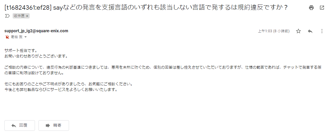 巴哈討論回覆:有玩家對官方詢問在say等等發言使用「非支援語言」會不會違反規約?
